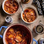 Traditional Lancashire hot pot is usually made with lamb and cooked with broth. This version takes a few liberties. I use beef instead of lamb and stout and crushed tomatoes in place of stock. But the structure stays the same: meat and vegetables topped with sliced potatoes and baked in the oven. The result is still firmly in hot pot territory if you ask me.